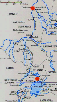 Die linke Karte zeigt das Quellgebiet des Weißen Nil, die rechte Karte das Quellgebiet des Blauen Nil. Die beiden Kartenausschnitte sind relativ klein geraten, es ist aber dennoch recht gut zu erkennen, wo die beiden Wasserläufe beginnen. Sowohl das jeweilige Quellgebiet wie auch der Zusammenfluss bei Khartum, sind zusätzlich mit einer roten Markierung versehen. |